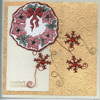 The card was sprayed with Memories Mists then the scroll was stamped using the co-ordinating ink pad that comes with the Memories Mist. The Penny Black stamp has been stamped then coloured using a Pearl-ex Palette, the co-ordinating ink has been sponged around the edge then the image has been layered on to various card and mounted on to the card.